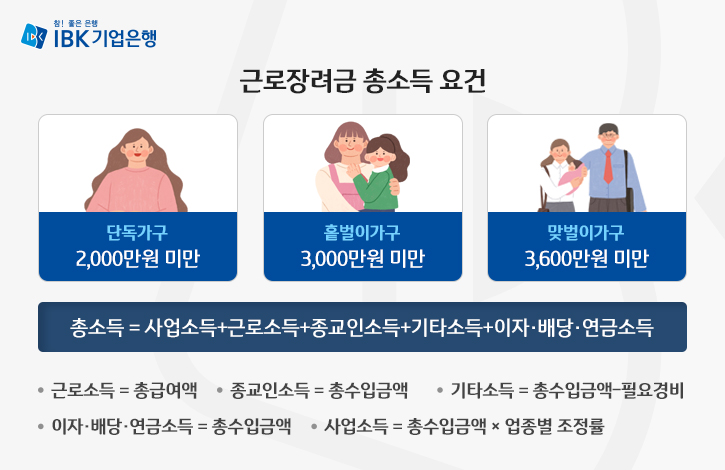 총소득은 사업소득, 근로소득, 종교인소득, 기타소득, 이자·배당·연금소득을 합한 값으로, 단독가구는 2,000만원, 홑벌이가구 3,000만원, 맞벌이가구 3,600만원 미만일 때에만 근로장려금을 지급받을 수 있습니다.