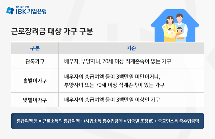 근로장려금 신청 가능여부를 알아보기 위해서는 우선 본인이 속한 가구가 단독가구, 홑벌이가구, 맞벌이가구에 해당하는지를 확인하셔야 합니다. 각 가구는 가족 구성원에 따라 다음과 같이 구분됩니다.