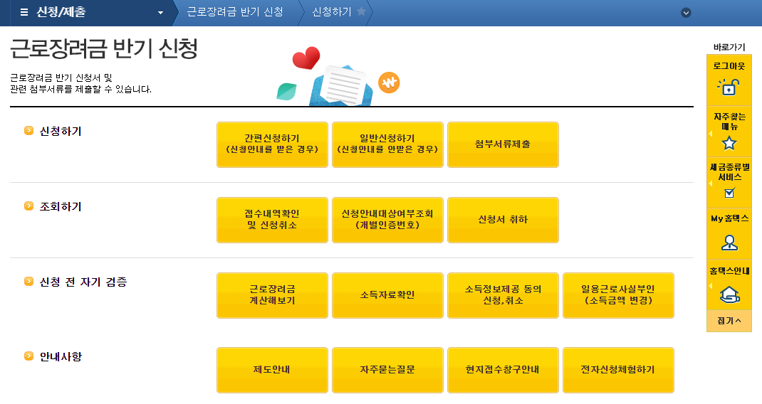 홈택스(hometax.go.kr) 홈페이지 로그인 – 신청/제출 – 근로장려금.자녀장려금신청