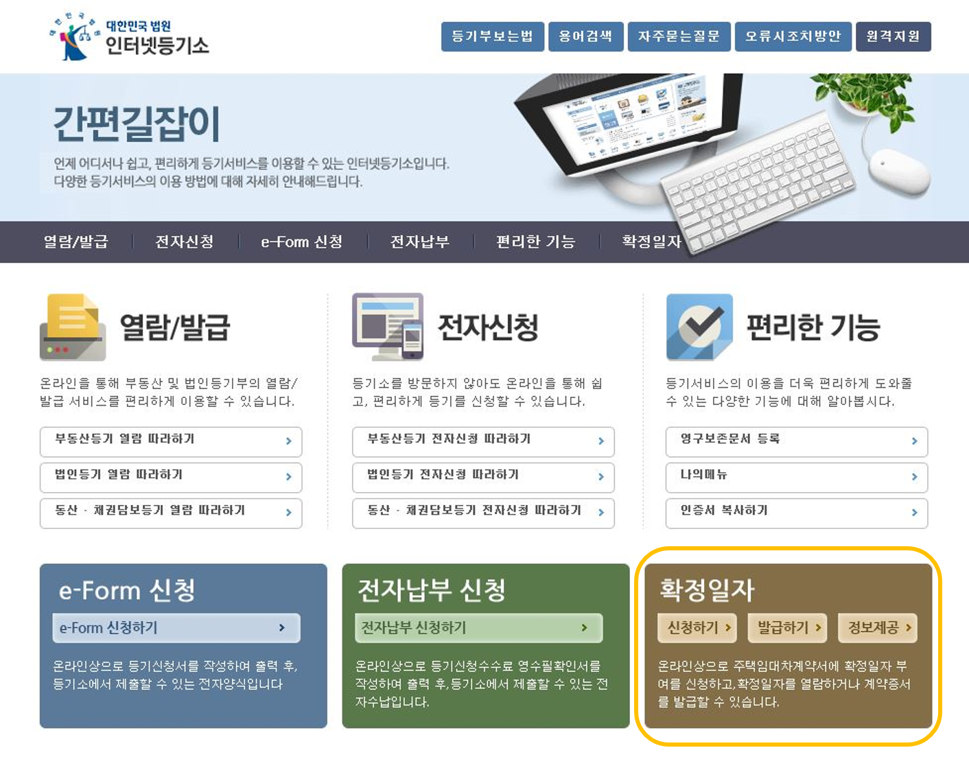 사정상 직접 방문하기 어렵다면 인터넷으로도 어렵지 않게 확정일자를 받을 수 있습니다. 대한민국 법원 인터넷 등기소 홈페이지에서 ‘확정일자 신청하기’란을 클릭하면 바로 신청 페이지로 이동합니다. 아래 가이드에 따라 정보를 입력하면 빠르고 간편하게 확정일자를 받을 수 있습니다.