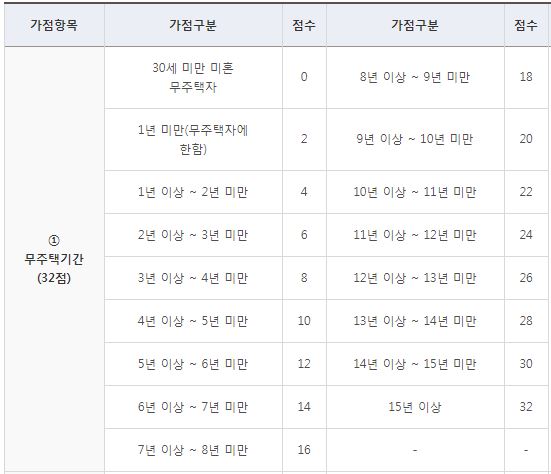 무주택 기간이 15년 이상인 경우 최대 32점의 가산점을 획득할 수 있습니다. 무주택 기간은 결혼 여부에 따라서도 시작 시점이 다르므로 아래의 기준을 잘 살펴야 합니다.