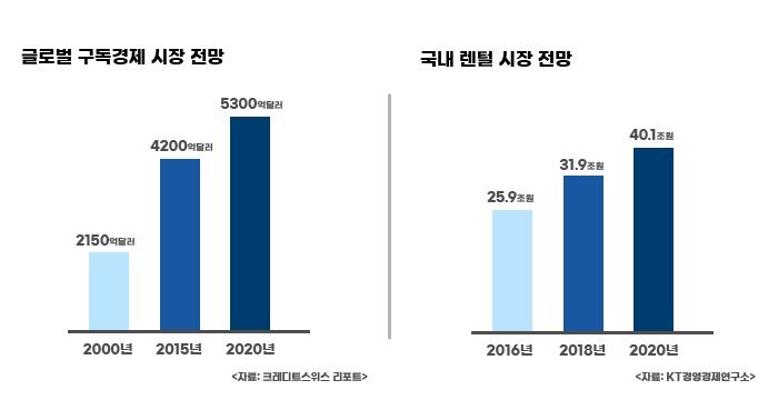 현재 글로벌 구독경제 시장의 규모는 빠른 속도로 성장하고 있습니다. 구독경제의 일종인 국내 렌털시장의 규모 또한 2016년 약 25.9조에서 2020년 약 40.1조로 엄청난 상승세를 보이고 있는데요. 이러한 급속 성장의 이유는 무엇일까요?