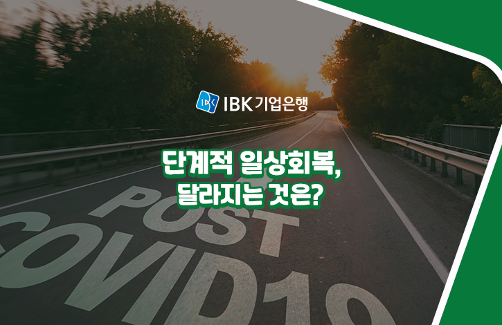 오늘은 단계적 일상회복을 위한 거리두기 1차 개편안에 대해 알아보았습니다. IBK와 함께 달라진 방역 수칙 확인 완료! 적극적인 방역을 통해 모두가 일상으로 돌아갈 수 있기를 기원하며, IBK기업은행은 변화하는 방역 정보를 신속하게 전달하겠습니다.