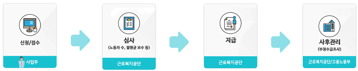 신청이 접수된 후에는 고용보험의 DB연계, e-나라도움 등 시스템을 통해 요건을 검증받게 되는데요! 심사가 완료되면 사업장의 계좌로 근로복지공단이 매월 15일(월 1회) 지원금을 지급하게 됩니다. 지급이 이루어진 후에도 부정수급을 조사하기 위한 사후관리가 계속되니사실이 아닌 내용을 기반으로 안정자금을 신청하지 않도록 유의해 주세요!