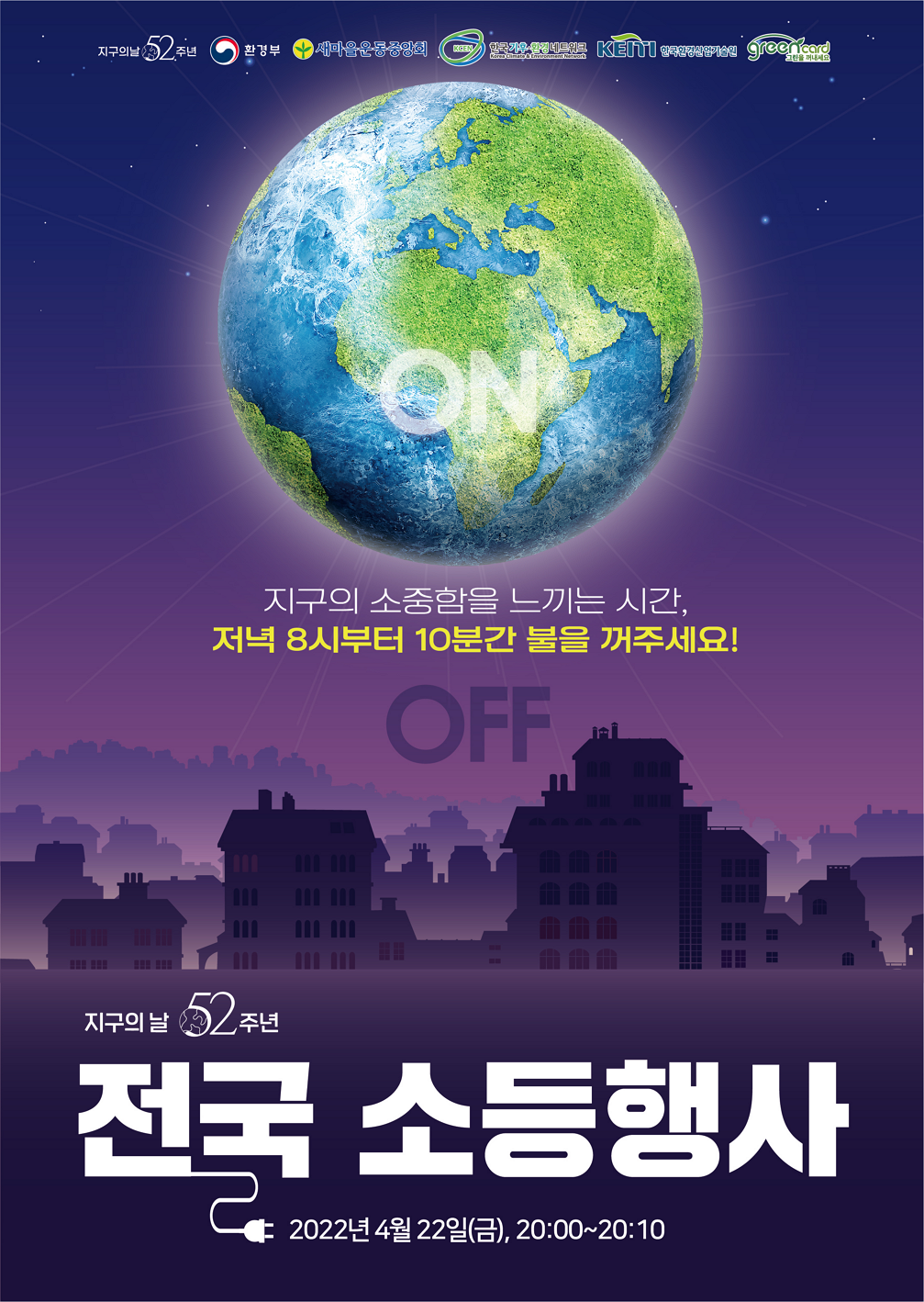 환경부에서는 지구의 날 52주년을 맞이해 4월 22일부터 일주일 간 <제14회 기후 변화 주간>을 운영합니다! 기후 변화 주간엔 탄소 중립의 중요성을 알리고 국민들의 자발적인 실천을 독려하고 있어요. 올해 지구의 날은 저탄소 생활 실천의 중요성을 알리기 위해 4월 22일 저녁 8시부터 10분간 '전국 소등 행사'를 진행합니다. 집에서도 직장에서도 어디서든 간단하게 참여할 수 있어요. 지구를 위한 10분만 해보는 게 어떨까요?