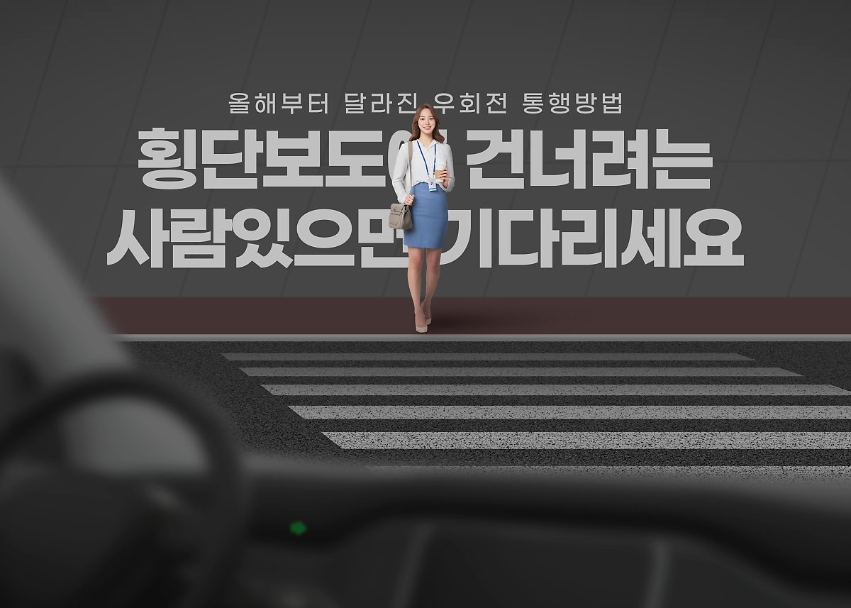 현행법상 교차로에서는 비보호 우회전을 적용해 교통 흐름에 방해가 되지 않거나 보행자가 없어도 보행 신호와 상관없이 우회전할 수 있었죠. 도로교통법 제27조 제1항이 개정되어 횡단보도 위 보행자가 없어도 일시정지해야 합니다! 보행자가 횡단보도를 통행하고 있을 때는 물론, 보도에서 보행자가 건너려고 할 때도 일시정지해야 합니다.