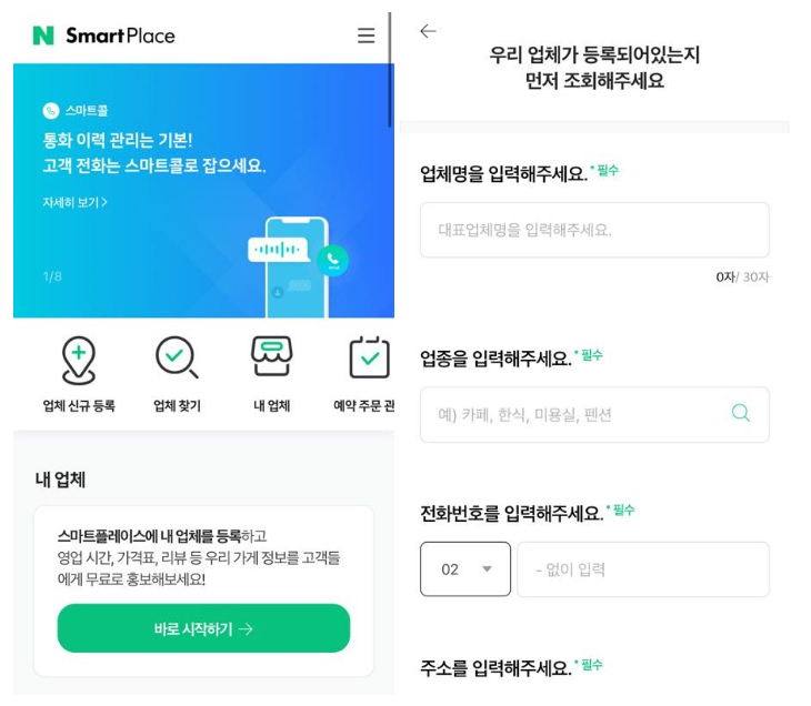 등록 절차는 간단한데요. 업체명, 대표 전화번호, 주소, 업종을 입력하여 중복 확인을 한 후 신청합니다. 개인 정보 수집 및 이용에 대한 동의, 스마트콜 사용을 신청할 경우 사용 동의를 체크하고 등록한 정보를 확인하면 끝! 딱 5분이면 네이버 스마트플레이스에 가게를 등록할 수 있습니다.