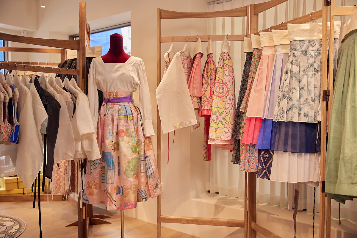 궁중의 아름다운 유물, 한국의 유산에서 영감을 얻어 리디자인 하고, 새로운 컬러를 조합해 전통과 현대가 조화로움을 이루도록 하는 것이 저의 역할이에요. 단하 제품에는 두 가지 라인이 있는데요. 기성라인과 오뜨꾸띄르 라인이에요. 기성라인은 주로 친환경 소재(오가닉 코튼), 리사이클 소재(폐 페트병 추출 원사 이용)를 사용해 공장에서 작업하는 방식이에요. 오뜨꾸띄르 라인은 버려진 웨딩드레스를 해체해 새로운 옷을 만들고, 빈티지 한복을 이용해 새로운 가치를 담아 직접 만드는 방식이에요.