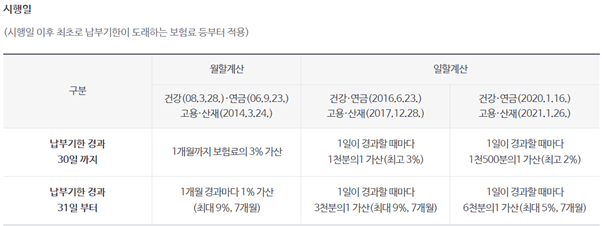건강보험공단에서는 체납자에 한해 연체금을 부과하고 있습니다. 연체된 이자는 다음과 같은 계산법으로 측정되는데요. 납부기한 경과 후 30일까지 매 1일이 경과할 때마다 체납보험료 등의 1/1500(최대 2%)의 연체금이 과금되며, 30일이 지난날부턴 매 1일이 경과할 때마다 체납보험료 등의 1/6000(최대 5%)을 가산하여 징수합니다.