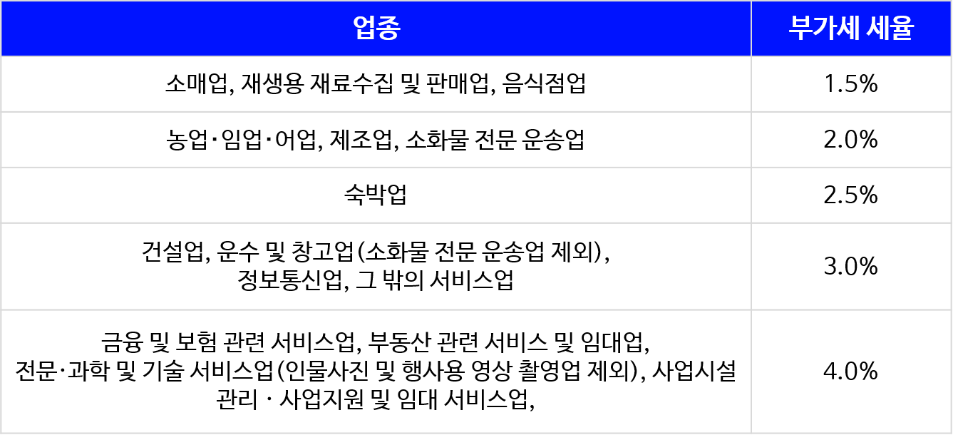 만약 A 사장님이 간이과세자라면 40만 원의 부가가치 중 최소 1.5%(6,000 원) ~최대 4.0%(16,000 원)의 부가세 세율을 적용한 금액을 납부해야 하는데요. 실제 부가세 세율은 각 업종 별로 차이가 있으니 간이과세자 사업자 분들은 아래 업종별 부가가치율을 통해 본인이 해당되는 사업의 세율을 확인하면 많은 도움이 될 것입니다.
