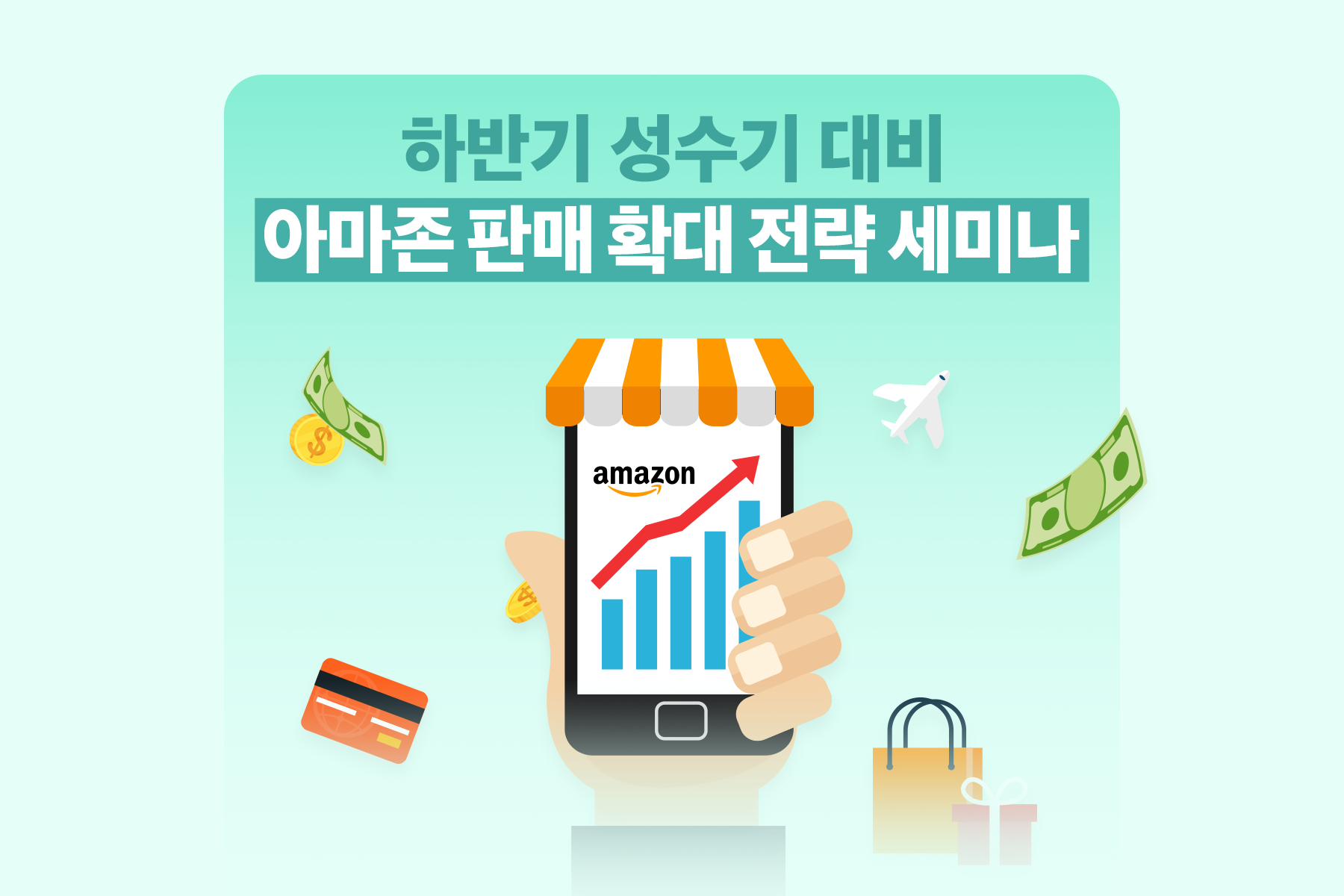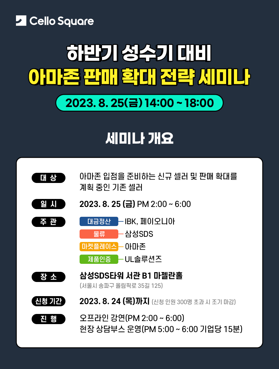 8월 25일 개최되는 이번 세미나는 아마존 신규 셀러부터 하반기 성수기를 대비해 수익을 극대화 하고자 하는 기존 수출 기업 모두를 위한 내용으로 준비했으며, 아마존의 입점 및 활용 노하우, 판매대금 인출, 해외 인증 등 각 분야 전문가가 전하는 아마존 해외 판매의 A to Z를 함께하실 수 있습니다.