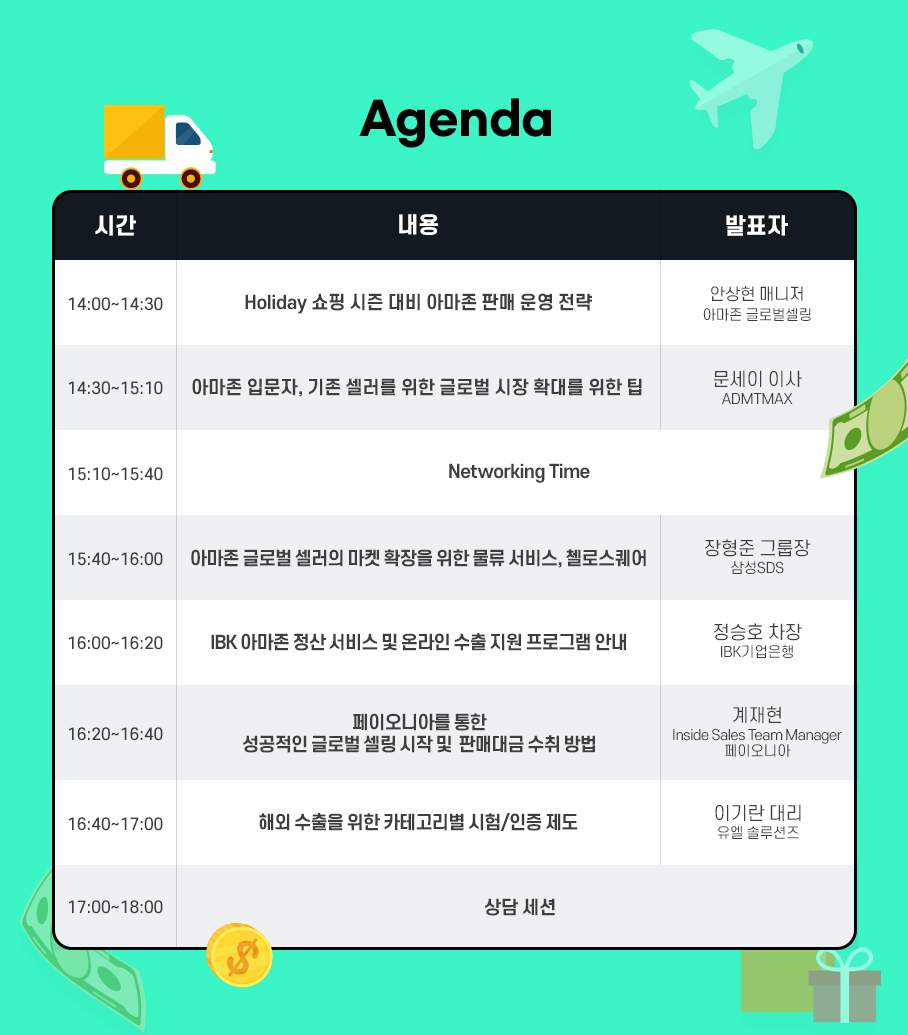 IBK기업은행을 포함한 삼성SDS, 아마존 글로벌셀링, 페이오니아, 유엘 솔루션즈 총 5개 회사의 전문가들이 분기마다 정기적으로 진행하는 세미나에 여러분을 초대합니다.