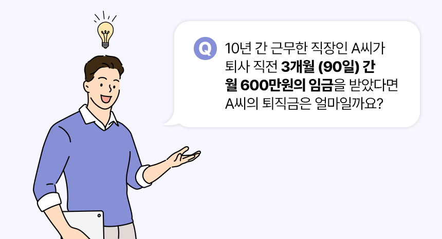 퇴직금을 산정하려면 먼저 1일 평균임금이 얼마인지 알아야 합니다. 여기서 말하는 ‘1일 평균임금’이란 퇴사 직전 3개월 동안에 퇴직자에게 지급된 임금의 총액을 이전 3개월의 총일 수로 나눈 금액인데요. 직장인 A 씨의 경우 퇴사 직전 3개월(90일) 간 월 600만 원씩 받았다면 1일 평균임금은 90/3000으로 20만 원이 됩니다.