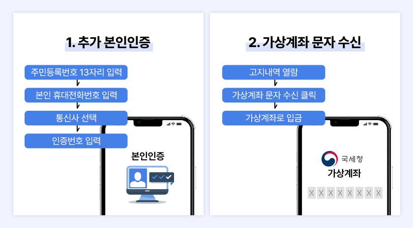 납부할 국세가 있는 경우에 한하여 추가적인 본인인증을 거쳐 고지내역을 열람하게 됩니다. 고지내역 열람 중 ‘가상계좌 문자 수신’ 버튼을 누르면 입력한 휴대전화 번호로 가상계좌가 포함된 문자 메시지를 받을 수 있어요. 수신받은 문자 메시지의 가상계좌를 활용하여 납부하면 됩니다.