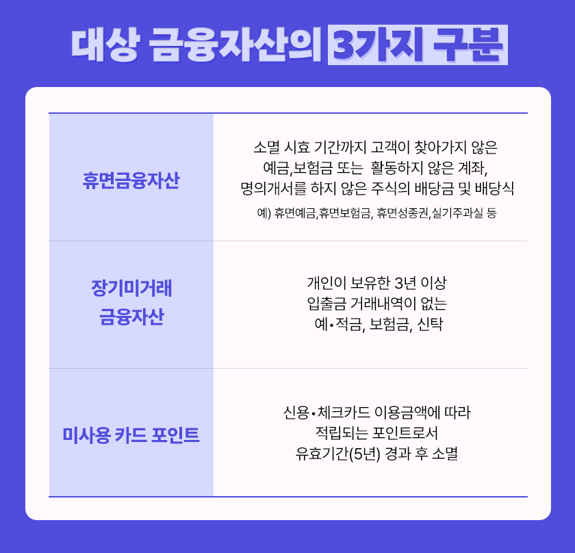 휴면 금융자산 / 장기미거래 금융자산 / 미사용 카드 포인트 세 가지 금융자산을 찾아볼 수 있으며,