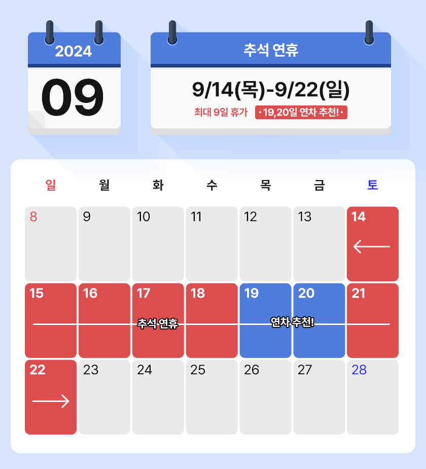 9월에는 최대 9일의 꿀 같은 추석 연휴가 기다리고 있는데요. 9월 16일(월)부터 9월 18(수)까지 3일간의 추석 연휴에 19일(목), 20일(금) 연차를 추가로 사용할 경우, 올해 가장 긴 연휴를 보내실 수 있는 달입니다. 미리 체크하고 올 추석 즐거운 연휴 보내세요!