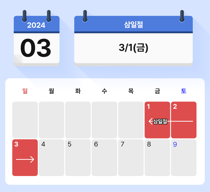 3월에는 연휴가 주말까지 이어지는 3월 1일(금) 삼일절이 있습니다.