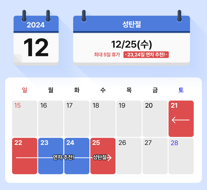 12월 25일은 모두가 기다리는 연휴 크리스마스인데요, 24년도 크리스마스는 평일인 수요일로 연차는 23일(월), 24일(화)로 사용하시면 5일간의 행복한 크리스마스 연휴를 보내실 수 있답니다