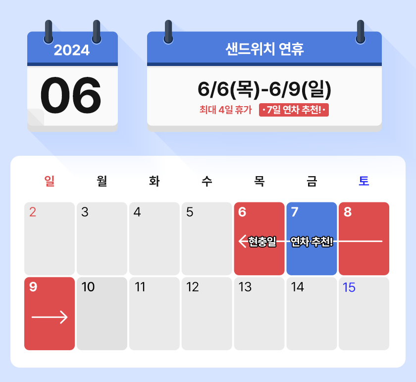 6월은 샌드위치 연휴가 있는 달로 6월 6일(목) 현충일과 주말 사이에 평일이 끼어 있는데요 6월 7일(금) 연차를 사용한다면 4일 동안의 연휴가 완성됩니다!
