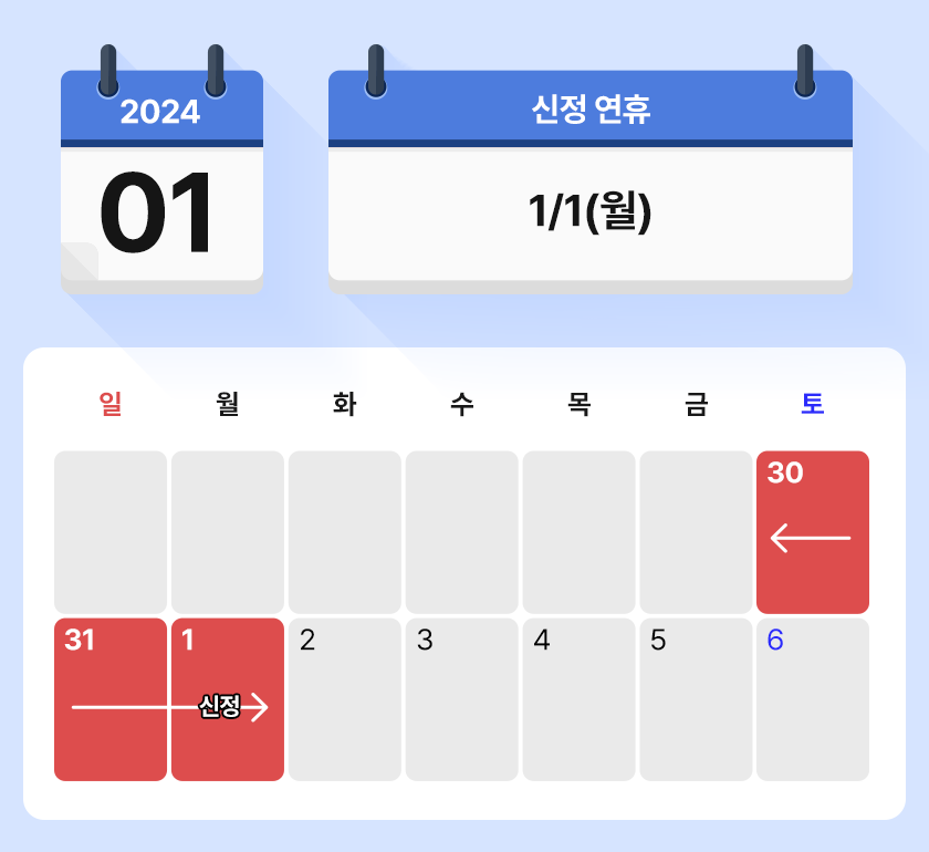24년도 첫 연휴인 1월 1일 신정은 평일인 월요일로, 주말부터 시작되어 12월 30(토)~1월 1일(월)까지 이어집니다.