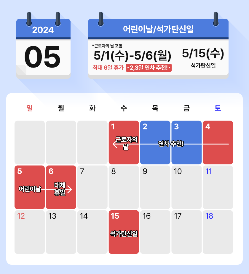 5월에는 5월 5일(일) 어린이날과 5월 15일(수) 석가탄신일이 있는데요. 근로자의 날인 5월 1일(수)까지 포함할 경우, 5월 2일(목). 5월 3일(금) 연차 사용하여 최대 6일간의 휴가를 보낼 수 있다는 점 참고해 주세요!