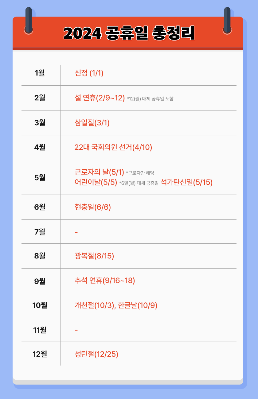 매번 공휴일이 언제인가 찾을 필요 없이 IBK기업은행이 2024년 공휴일부터 연차 추천까지! 한 번에 총정리해드릴 테니 모두 주목해 주세요 😊