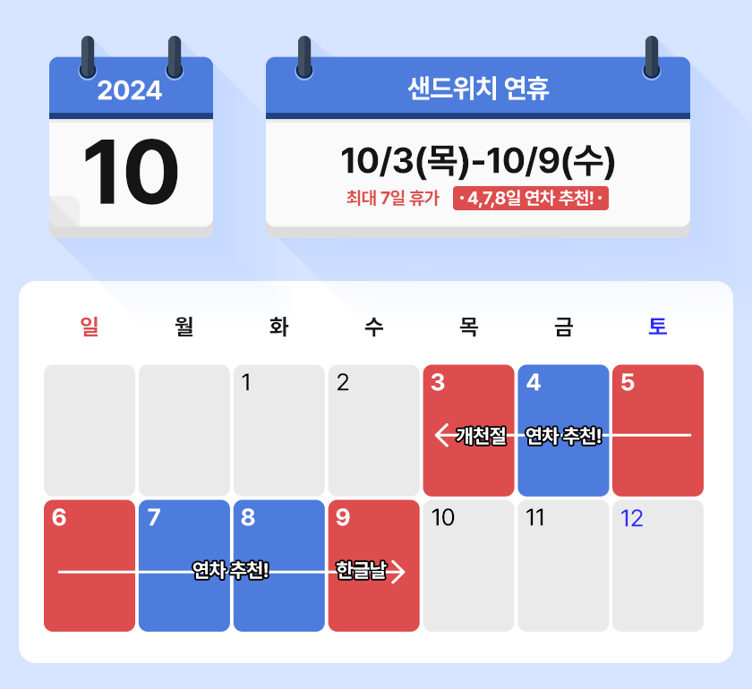 10월에도 샌드위치 연휴로 10월 3일(목) 개천절과 10/9일 한글날 사이에 평일이 끼어 있어 연차 사용 시, 4일(금), 7일(월), 8일(화)을 추천드립니다.