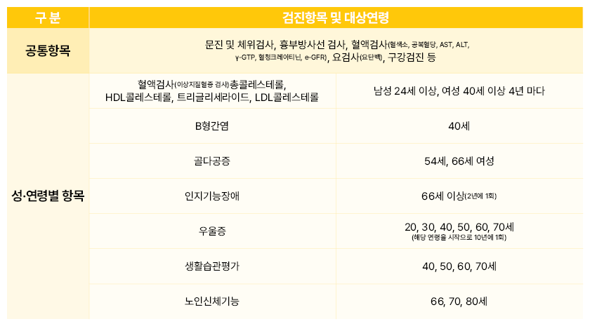 요검사, 구강검진 등으로 이루어지며, 연령과 성별에 따라