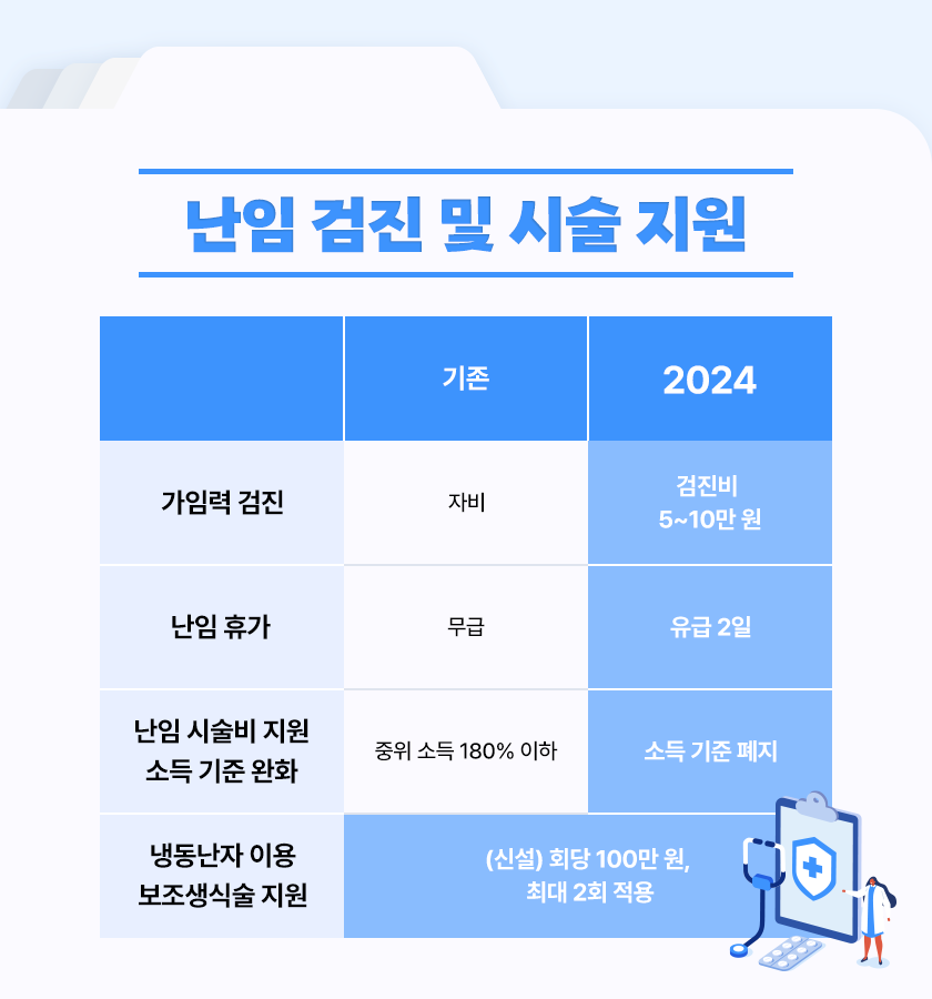 가임력 검진의 검진비를 5~10만 원까지 지원합니다.