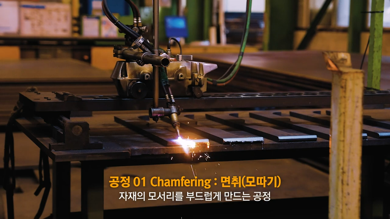 산소면취기를 사용해 가공된 철판의 모서리를 면취합니다.