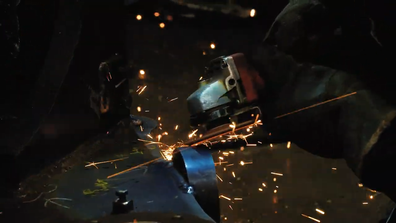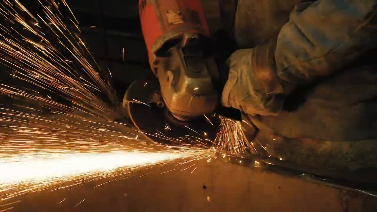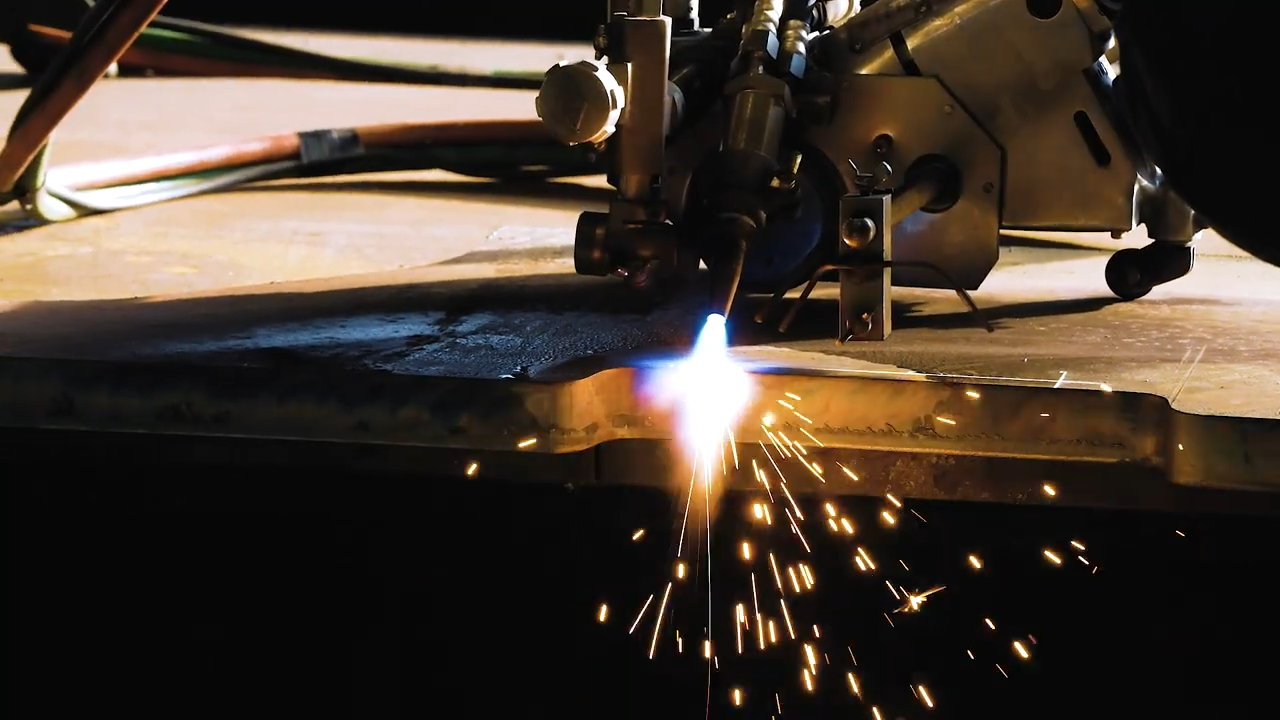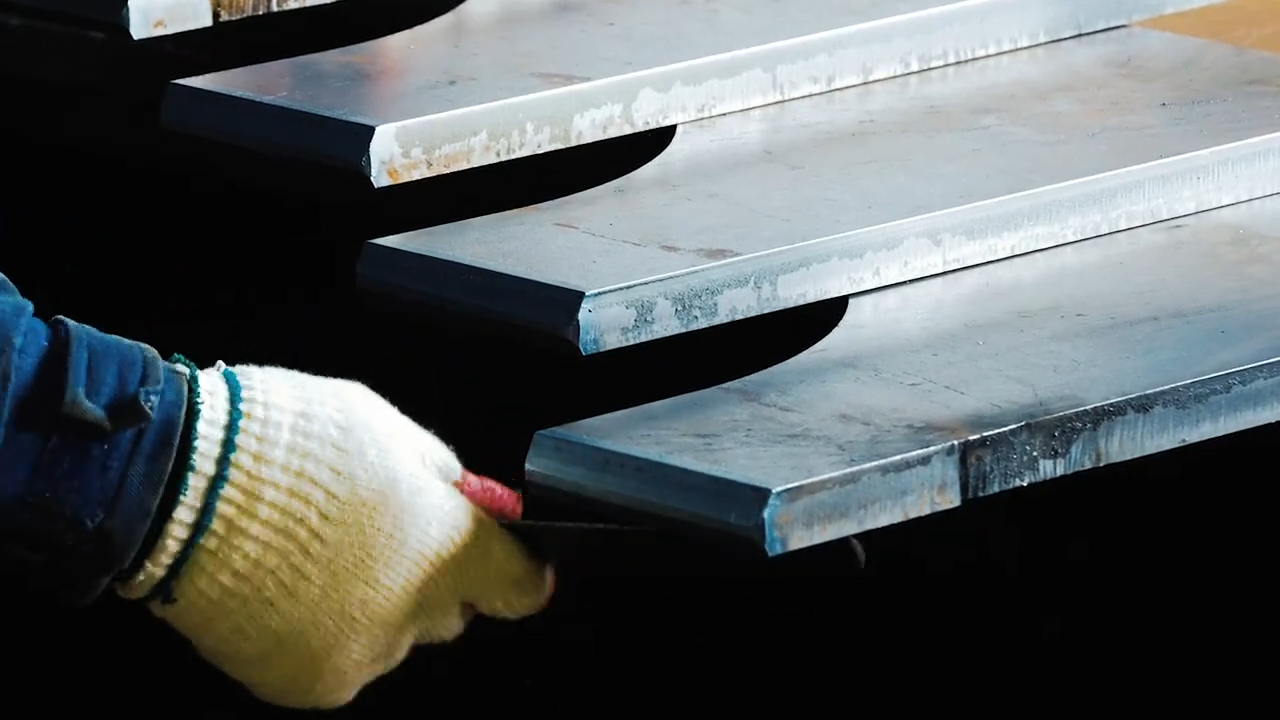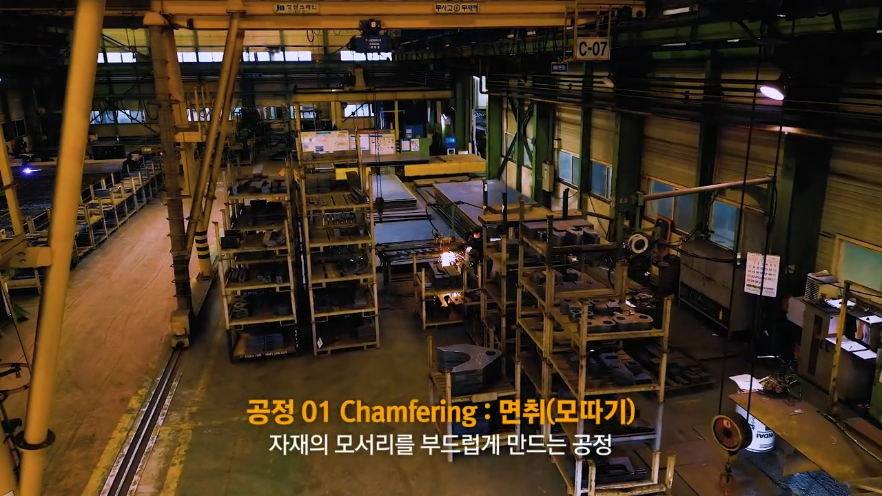 산소면취기를 사용해 가공된 철판의 모서리를 면취합니다.