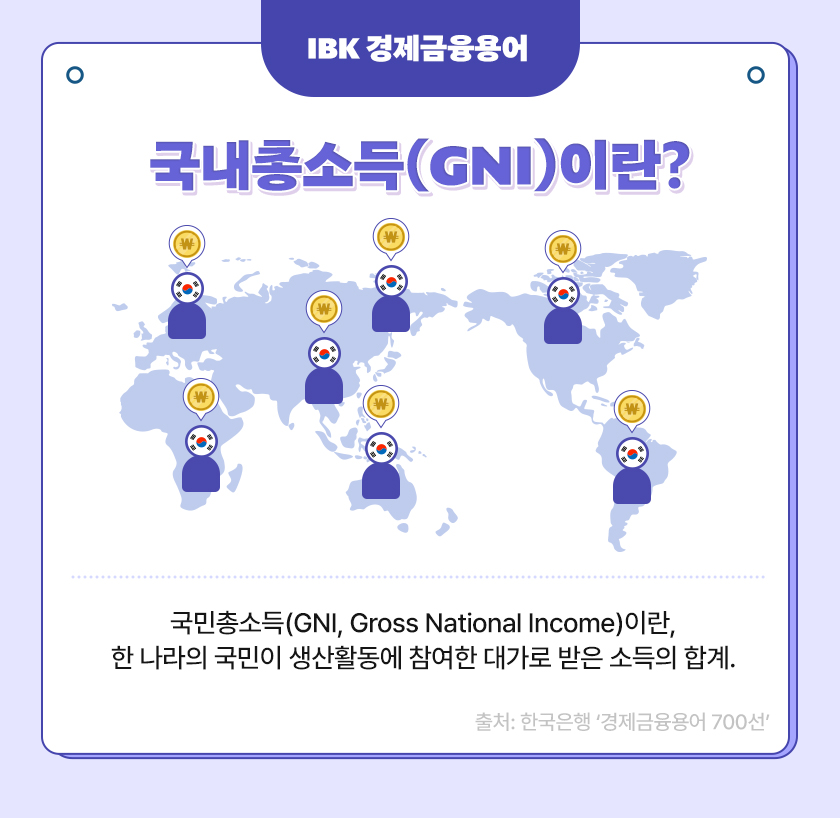 GNI는 ‘국민’을 기준으로 ‘전 세계의 자국민이 창출한 소득’을 나타내죠.