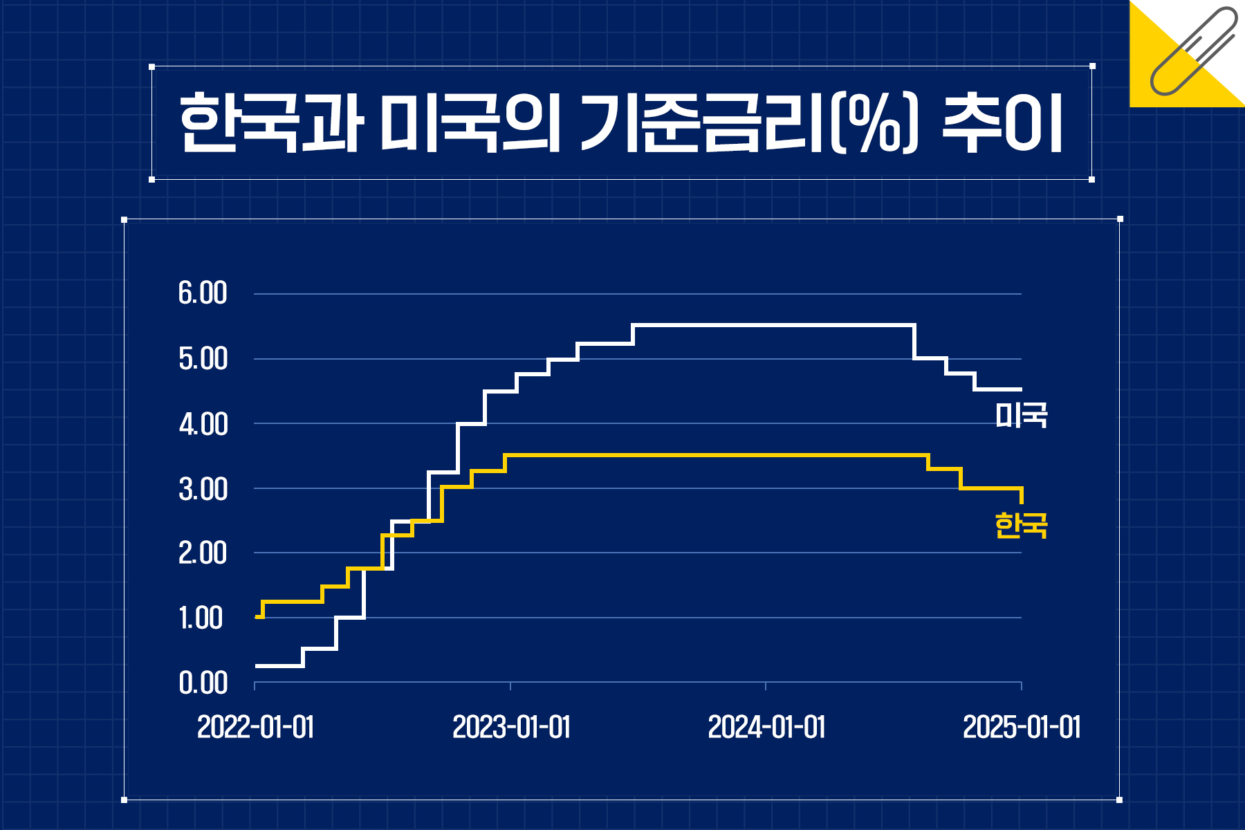 2022년 1월부터 미국의 기준금리(상단 기준) 추이를 보면 0.25%, 0.50%, 1.00%, 1.75%를 유지하다가 7월 27일 2.50%로 인상하였다. 반면 한국은 2022년 1월부터 1.00%, 1.25%, 1.50%, 1.75%를 유지하다가 7월 13일 2.25%로 인상하였다.