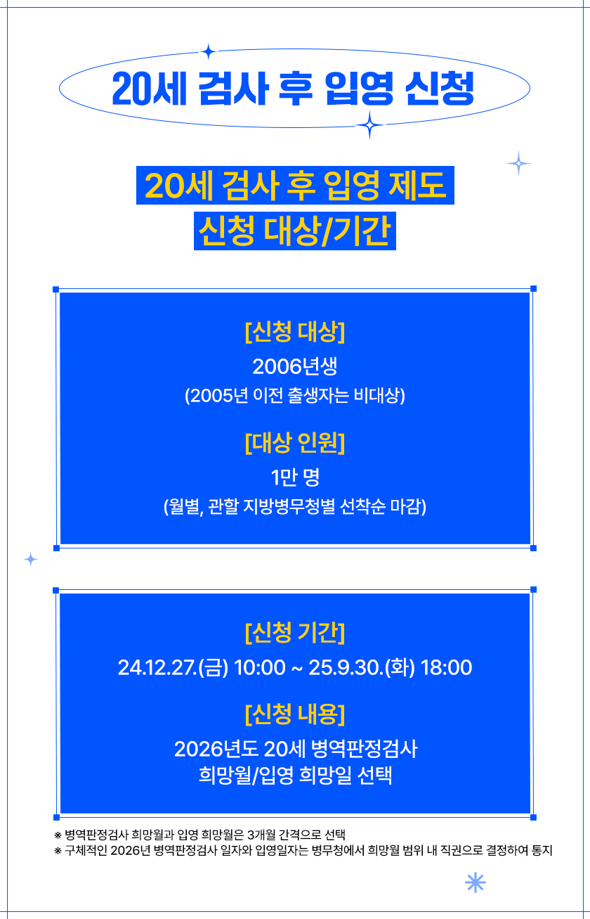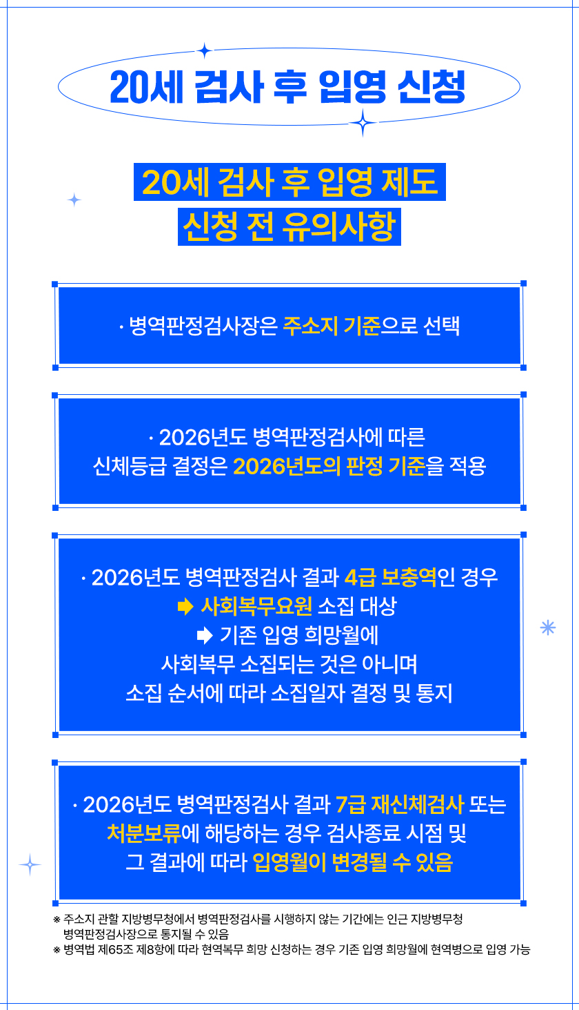 ※ 구체적인 2026년 병역판정검사 일자와 입영일자는 병무청에서 희망월 범위 내 직권으로 결정하여 통지