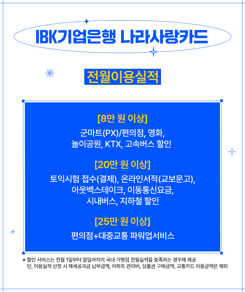 ※ 할인 서비스는 전월 1일부터 말일까지의 국내 가맹점 전월실적을 충족하는 경우에 제공