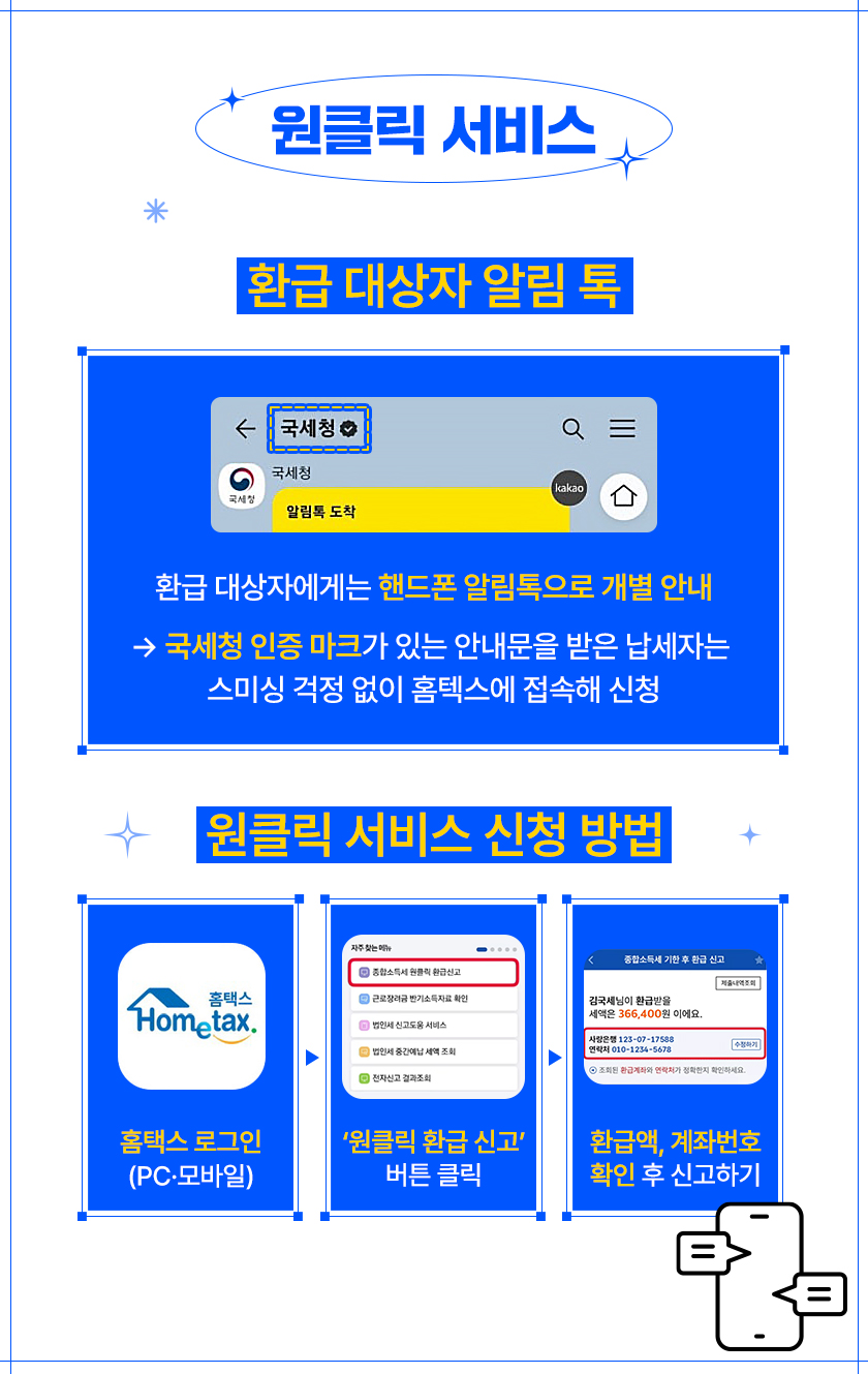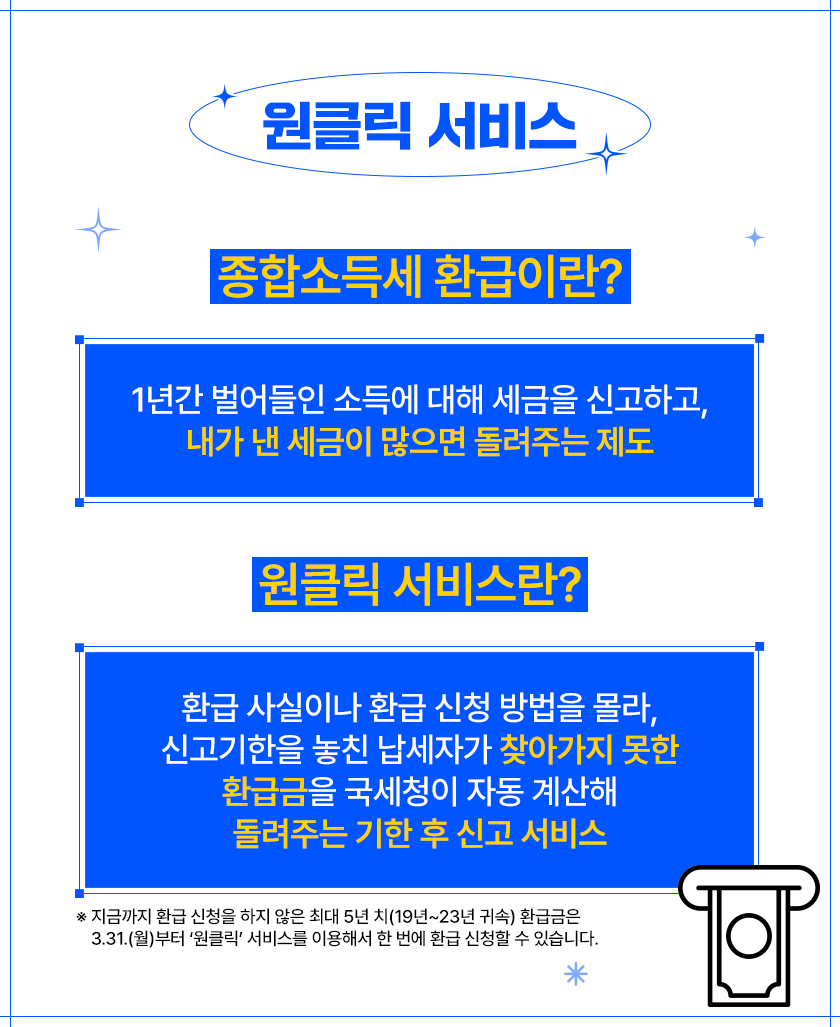 3.31.(월)부터 ‘원클릭’ 서비스를 이용해서 한 번에 환급 신청할 수 있습니다.