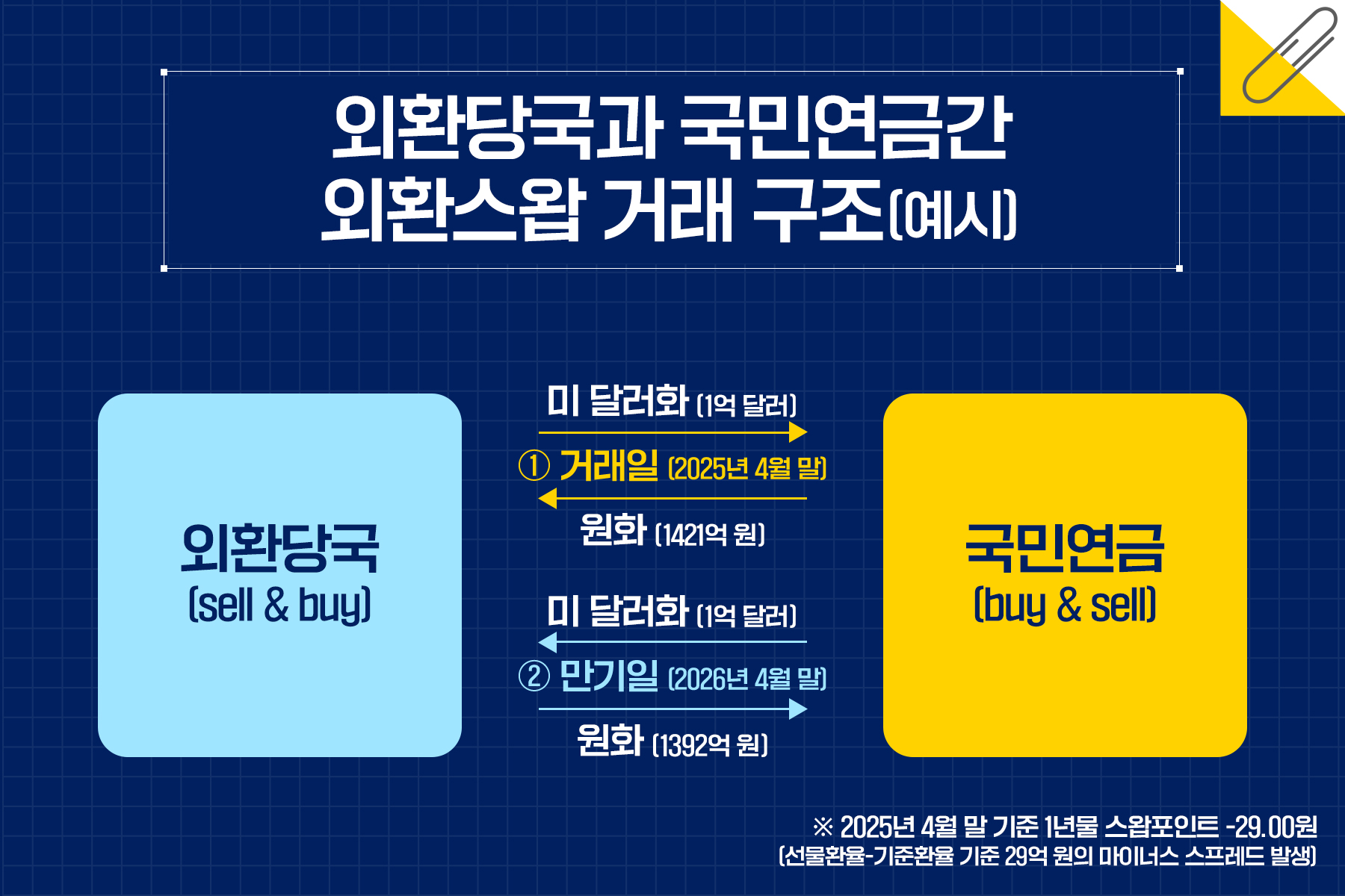 국민연금이 달러가 필요하다고 하면 외환당국은 달러를 주고 원화를 받는다. 예컨대 12개월 만기로 1억 달러를 준다고 가정하면 거래일에 1억 달러 상당의 원화는 거래일의 매매기준율(기준환율)을 적용하여 계산하게 된다. 만기일에 가서는 국민연금은 외환당국에 1억 달러를 지급하는데 외환당국이 지급할 원화는 이미 거래일에 고시된 기준환율과 선물환율의 차이(스왑포인트 * )를 감안하여 지급하게 된다.