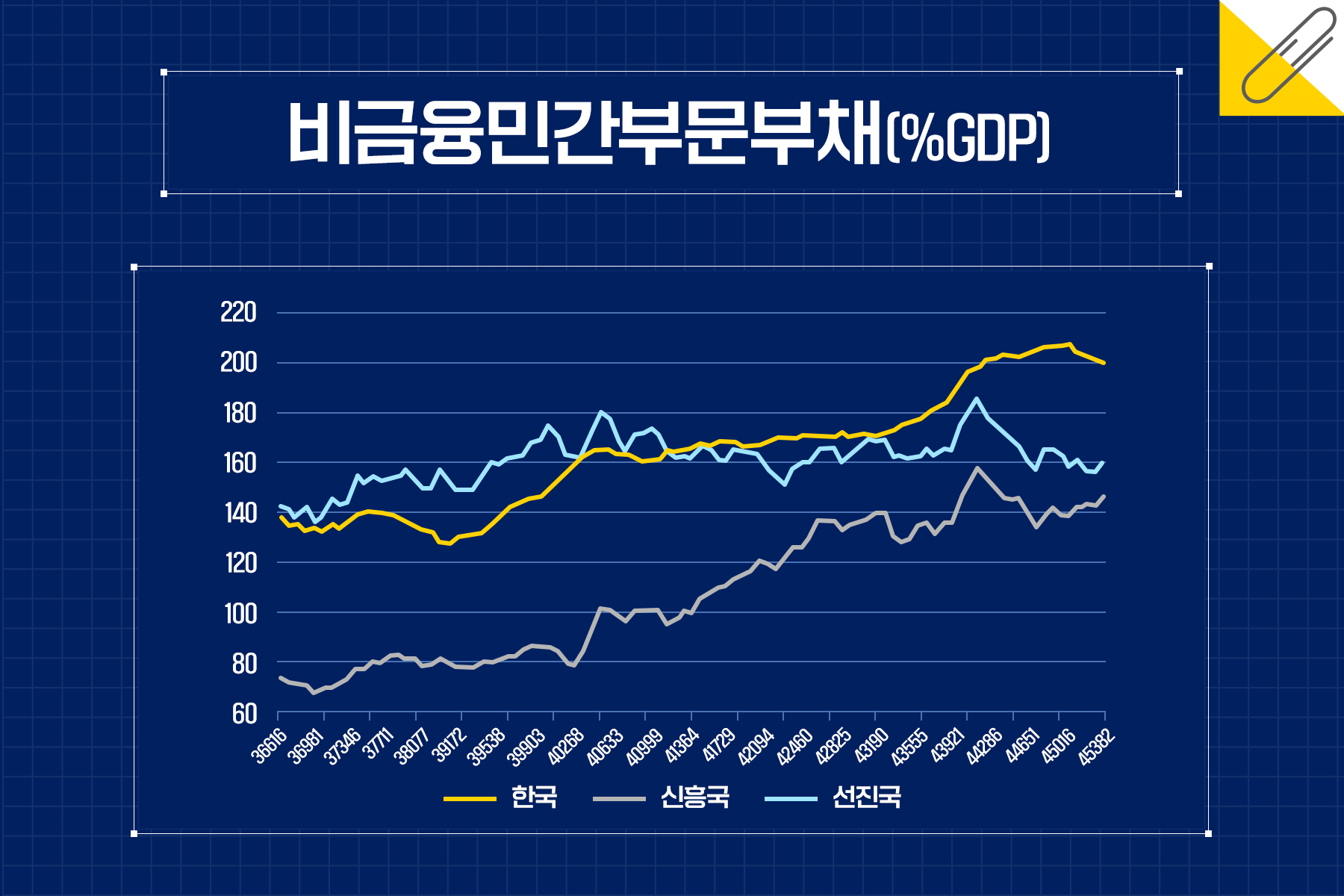 2000년-2024년 기간 동안 우리나라, 선진국, 신흥국 GDP대비 비금융민간부문(비금융기업과 가계 및 비영리단체)의 부채비율을 보여주는 데 관련해 세 가지 중요한 사실을 반영한다. 우선 신흥국보다 높은 선진국의 부채비율은 금융발전에 따라 활성화된 자금중개가 성장을 촉진한 결과물이다.