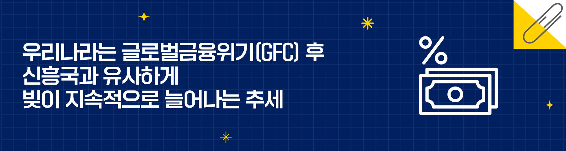 우리나라는 글로벌금융위기(GFC) 후 안정적인 모습을 보이는 선진국과 달리 신흥국과 유사하게 빚이 지속적으로 늘어나는 추세