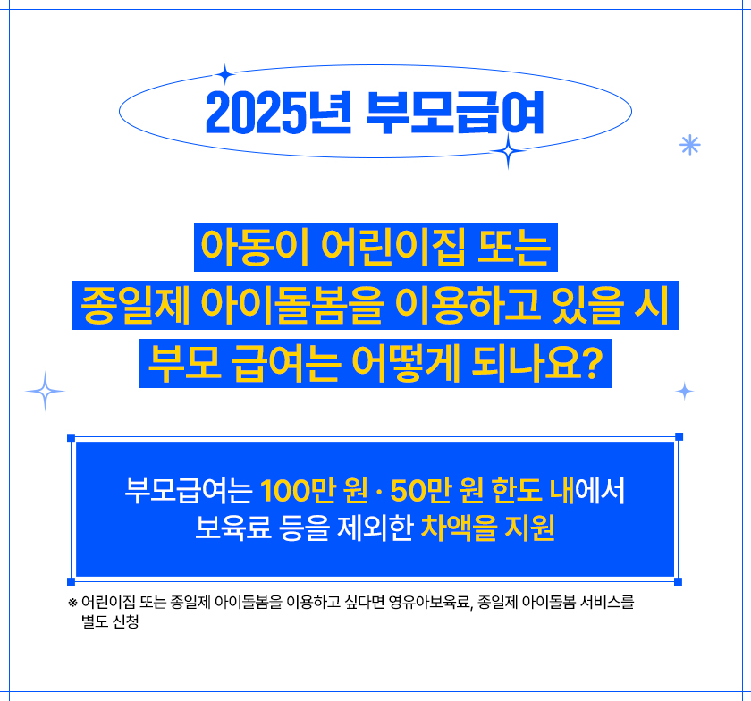 ※ 어린이집 또는 종일제 아이돌봄을 이용하고 싶다면 영유아보육료, 종일제 아이돌봄 서비스를 별도 신청