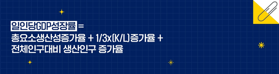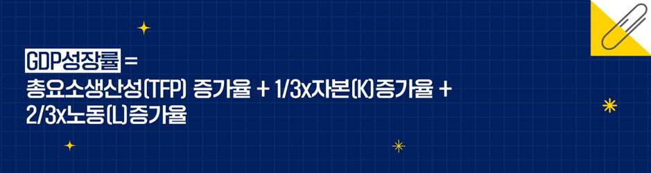 지속가능성장, 즉 ‘1% 성장하락의 법칙’의 성장에 해당하는 총요소생산성*(TFP)은 생산요소의 쓰임새를 측정하며. 경제여건이 시장친화적일수록 높다. 모수 1/3(2/3)은 국민소득에서 차지하는 자본(노동) 소득의 비중이다.