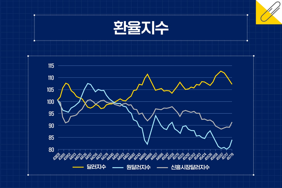 2025년 5월 주요 통화 대비 달러화가 65개월 만에 6.4% 상승하는 동안 달러화 대비 원화는 그 두 배가 넘는 16.1%, 신흥국은 8.9% 그 가치가 하락했다.