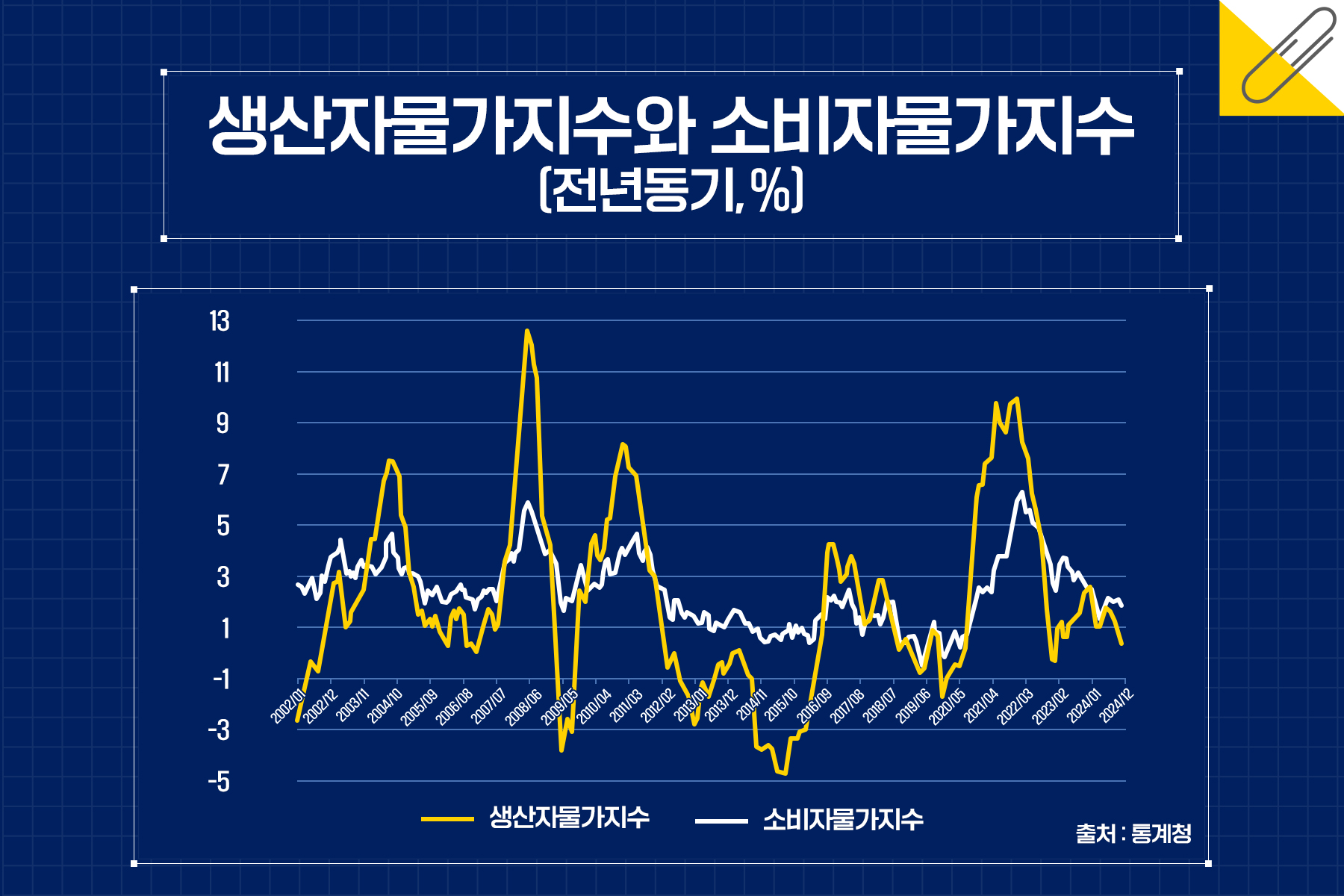 생산자물가지수는 한국은행이 발표하는데 소비자물가지수와 움직임을 비교하면 위와 같은데 소비자물가지수에 비해 상대적으로 변동성이 크다는 것이다. 생산자물가지수는 소비자물가지수에 비해 가격변동폭이 심한 이유는 원재료, 중간재 및 자본재를 포함하고 있기 때문이다.