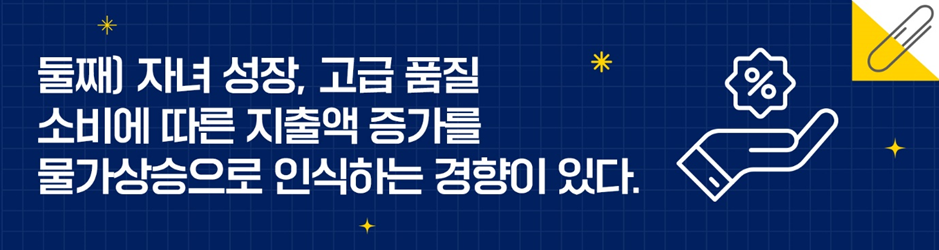 둘째는 자녀 성장, 고급 품질 소비에 따른 지출액 증가를 물가상승으로 인식하는 경향이 있다.