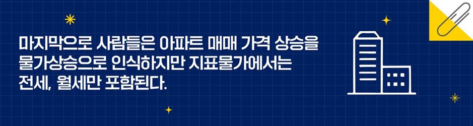 마지막으로 사람들은 아파트 매매 가격 상승을 물가상승으로 인식하지만 지표물가에서는 전세, 월세만 포함된다.