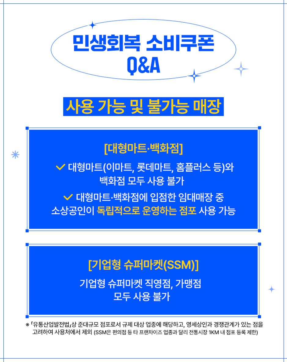 고려하여 사용처에서 제외 (SSM은 편의점 등 타 프랜차이즈 업종과 달리 전통시장 1KM 내 점포 등록 제한)