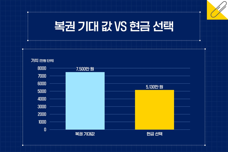 이 퍼즐을 비유하자면 각각 50% 확률로 5천 만원, 1억 원에 당첨되는 복권을 생각해 보자. 이 복권의 기대 값은 7.5천만 원이다. 그런데 이 복권 대신 현금 5.13천만 원을 더 선호하는 극단적인 위험회피성향의 사람을 찾기는 매우 어렵다.