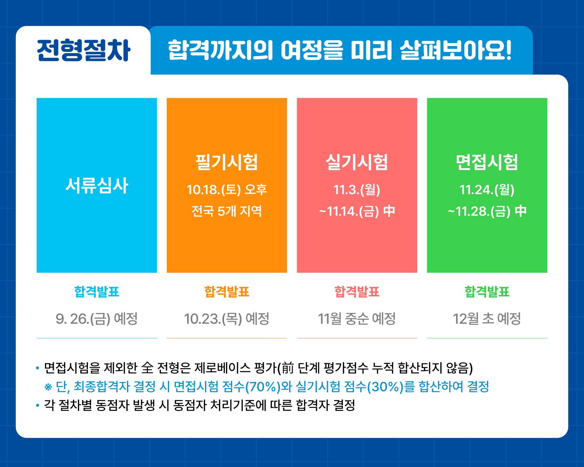 전형절차는 서류 → 필기 → 실기 → 면접 순으로 진행됩니다.