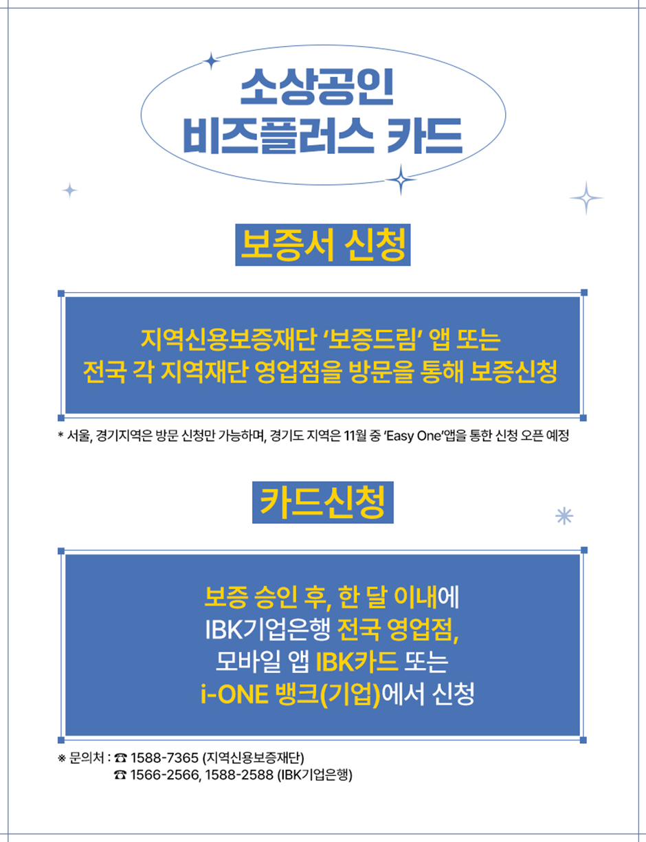 ※ 위 안내는 주요 내용을 요약한 것으로 보증서 발급 관련은 각 지역신용보증재단, 카드 상품 관련은 IBK기업은행 고객센터 ☎1566-2566으로 문의바랍니다
