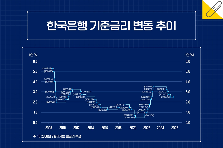 한국은행 금융통화위원회는 물가 동향, 국내외 경제 상황, 금융시장 여건 등을 종합적으로 고려하여 연 8회 기준금리를 결정하고 있다. 이렇게 결정된 기준금리는 초단기금리인 콜금리에 즉시 영향을 미치고, 장단기 시장금리, 예금 및 대출 금리 등의 변동으로 이어져 궁극적으로는 실물경제 활동에 영향을 미치게 된다. 2007년 이후 한국은행 기준금리 추이를 보면 2008년 9월 글로벌 금융위기와 2020년 3월 코로나19 위기 등 불경기 당시에 기준금리를 크게 내린 것을 확인할 수 있다.